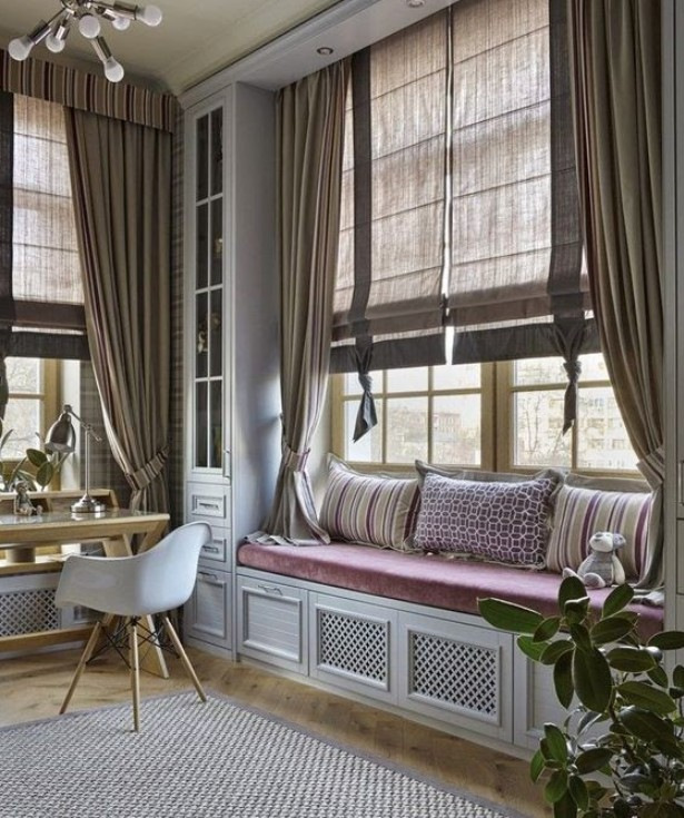 Римські штори чудово поєднуються з портьєрами. Встановлені на одному вікні, вони можуть добре його прикрашати. У кімнатах з ліжком, диваном або кріслом варто використовувати декоративні подушки виготовлені з того ж матеріалу, що і римські штори. Також чудово виглядатимуть і тканини, підібрані на контрастній основі.